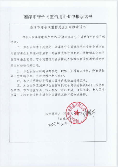 本企業(yè)根據(jù)《湘潭市守合同重信用企業(yè)申報規(guī)定》等編制 2022 年度企業(yè)信用報告書,并保證本報告書內(nèi)容真實(shí)、準(zhǔn)確、完整。